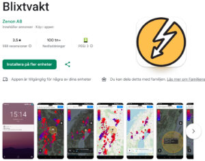 Blixtvakt: Gratis (med reklam) Reklamfritt 9 – 199 kr. på svenska. Släppt mars 2016, uppdaterad jan 2026. Realtidsinformation om blixturladdningar i din närhet. Varje blixt som registreras i Sverige visas direkt på kartan. Bra för säkerhet i fjäll, på hav eller på utflykt. Åskhistoria senast dygnet, väderprognos närmsta timmen. Pro versionen ger åskhistoria, långtidsprognoser närmsta dagarna, reklamfritt, extra varningsområden. Ladda upp appen från Google Play