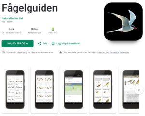 Fågelguiden: 199 kr. Finns på svenska (och Eng, Ty, Fra och Norska). Släppt juni 2017, uppdaterad nov 2025. ”Bäst i klass”. Utgår från boken ”Fågelguiden” (Larsson, Mullarneys, Zetterström) och presenterar 700 arter på 3500 illustrationer. 750 fågelläten. Artnamn på 18 språk. Listverktyg där du kan på karta kan registrera fynd, plats och datum. Ladda upp appen från Google Play