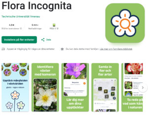Flora Incognita: Gratis utan reklam, på engelska. Släppt april 2018, uppdaterad dec 2025. Identifiera med mobil genom att ta en bild som analyseras av AI, samla växterna på karta. Omfattande faktablad kring arterna. En app utvecklad av forskare där du bidrar till forskningen med dina bilder. Artiklar berättar om forskningsprojekten. webbplats www.floraincognita.com Ladda upp appen från Google Play