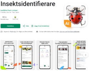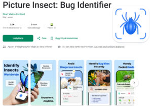 Picture Insect: Bug Identifier: 31 – 485 kr, på engelska. Släppt okt 2019, uppdaterad sec2025. Ett lättanvänt verktyg för insektsidentifiering som använder AI-teknik. Ta bara ett foto av en insekt eller ladda upp en från ditt bildgalleri, så berättar appen allt om arten. 4000+ insektsarter. Uppslagsverk över insekter med vetenskapligt namn, utseende, bilder, egenskaper m.m. Faror, förebyggande och hantering av insektsbett. Identifiera skadedjur från deras skador och hur du blir av med dem, registrera dina observationer i egen artsamling. Ladda upp appen från Google Play