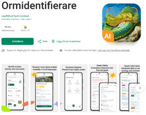 LeafMind Ormidentifierare: 37 – 1099 kr, på engelska. Släppt mars 2025, uppdaterad dec 2025. Ta en bild eller ladda upp bild och AI identifierar arten. Arterna beskrivs med olika språks namn, egenskaper, miljö, utbredning, beteende, giftighet, säkerhet m.m. Ladda upp appen från Google Play