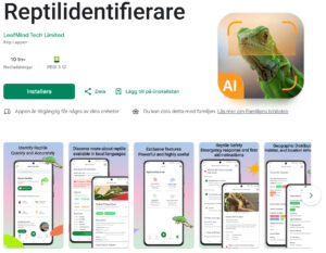 LeafMind Reptilidentifierare: 36 – 329 kr. på engelska. Släppt april 2025, uppdaterad jan 2026. Ta ett foto så identifierar AI omedelbart ormar, ödlor och sköldpaddor. Arterna beskrivs med beteenden, utbredning, livsmiljöer, föda, m.m. Skapa din egen artlista, säkerhetsvarningar för giftiga arter. Ladda upp appen från Google Play