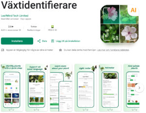 LeafMind Växtidentifierare: 39 – 999 kr, på engelska. Släppt aug 2021, uppdaterad dec 2025. Appen kan med hjälp av AI identifiera 25 000 växtarter från ditt foto. Ta en bild och du får information om växten såsom dess namn, ursprung, skötselråd. Bra även för trädgårdsväxter och innomhusväxter. Ladda upp appen från Google Play