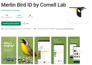 Merlin Bird ID by Cornell Lab: Gratis, på engelska. Släppt juni 2024, uppdaterad jan 2026. Populär app från Cornell Lab of Ornithology som identifierar fåglar via foto, ljud och plats. Kräver inloggning. Fåglar från hela världen. Du kan spela in eller lyssna på fåglars sång och läten och se dessa på sonogram. Identifierar även från bilder du tagit, eller utforska guidens bibliotek av fåglar och deras läten. Ladda upp appen från Google Play