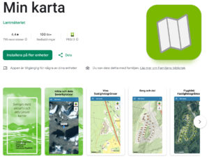 Min karta: Lantmäteriet: Gratis, på Svenska. Släppt maj 2020, uppdaterad dec 2025. Lantmäteriets topografiska webbkarta, flygbildskarta (ven historiska), terrängskuggning, berodalkarta, fastighetsgränser, sökfunktion via adresser, fastighetsbeteckning, ortnamn eller koordinater. Mäta på kartan, markera waypoints, spar områden och se i offlineläge. Ladda upp appen från Google Play