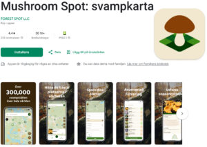 Mushroom Spot: svampkarta: 199 – 999 kr, på svenska och 6 språk. Släppt juni 2023, uppdaterad jan 2025. Svampkarta med 300 arter och 300 00 svampställen. Svampguide hjälper att identifiera svampen, lägg till dia svampställen på kartan, privat-bara du ser dem, eller dela observationer med vänner. Säsongsfunktion, svampnavigator – hittar till dina svampställen. Ladda upp appen från Google Play