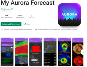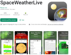 SpaceWeatherLive: Gratis med annonser, köp annonsfritt 11 – 119 kr, på engelska. Släppt sep 2018, uppdaterad aug 2025. Betraktas som den bästa norrskensappen. Se och förstå hyr aktiv norrskenet är just nu och chansen att se de närmaste dagarna. Fylld med all rymdväderinformation för nybörjaren och den avancerade, växla mellan norrskensaktivitet och solaktivitet, mörkerläge, push-meddelande om rymdväder, grafer, hjälpsektion för tolkning av data, FAQ, rymdväderarkiv från 1996 till i dag. Ladda upp appen från Google Play