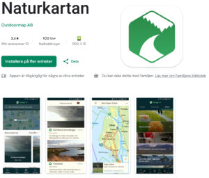 Naturkartan: Gratis, på svenska. Släppt juni 2017, uppdaterad dec 2025. Guide till Sveriges natur och friluftsliv. Naturreservat, vandringsleder, badplatser, fågeltorn m.m. presenterade på Lantmäteriets Terrängkartan och Fjällkartan. Innehåll från (ej samtliga) kommuner, Länsstyrelser, ledorganisationer. Ladda upp appen från Google Play