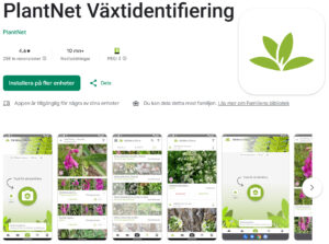 PlantNet: Gratis, på engelska. Släppt jan 2014, uppdaterad dec 2025. Ta ett foto eller ladda upp bild från ditt galleri och appen analyserar arten via olika floror. Den identifierar alla slags vilda växter som blomväxter, träd, gräs, ormbunkar, kaktusar m.m. med även odlade växter (park och trädgård).20 000 arter kan identifieras (av jordens 260 000 växtarter). Kartering av dina arter och faktablad om arten. Ladda upp appen från Google Play