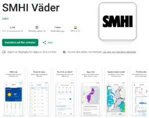 SMHI Väder: Gratis, på svenska. Släpptes maj 2011, uppdaterad okt 2025.Appen är fri från reklam. SMHIs prognoser sträcker sig 10 dygn framåt. Prognoskartor, radarkarta och vindkarta samt väderdiagram. Appen ger varningar och meddelanden från SMHI såsom brandrisk och höga temperaturer. Även prognoser för andra platser världen runt. Ladda upp appen från Google Play