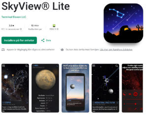 SkyView® Lite: Gratis, på engelska. Släppt okt 2014, uppdaterad okt 2025. Offline-läge. Augumented Reality (AR) App som använder mobilkameran för att exakt upptäcka och identifiera himlakroppar i himlen, dag eller natt. Rikta enheten mot himlen för att identifiera galaxer, stjärnor, konstellationer, planeter och satelliter (inklusive ISS och Hubble) passerar över din plats. Time Travel: Hoppa till framtiden eller det förflutna och se himlen på olika datum och tider. Stöd för Space Navigator ™ för kikare och teleskop. Ladda upp appen från Google Play
