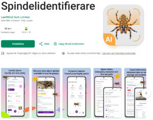 LeadMind Spindelidentiferare: 37 – 299 kr, på engelska. Släppt feb 2025, uppdaterad jan 2026. Ta ett foto eller ladda upp en bild från ditt galleri, och AI kommer att ge spindelns lokala namn, vetenskaplig klassificering, beskrivning med spindelns egenskaper, livsmiljö och beteende och en lista med referensbilder. Ladda upp appen från Google Play