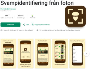 Svampidentifiering från foton: Gratis, på engelska och 30 språk. Släppt maj 2020, uppdaterad jan 2025. Ta bild och AI analyserar arten, databas med 12 000+ bilder. Kräver internetuppkoppling. 80% artidentifiering – Varning, ät inte svamp när du inte är helt säker på deras klassificering. Ladda upp appen från Google Play
