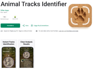 Animal Tracks Identifier: 59 – 299 kr, på engelska. Släppt juli 2025, uppdaterad juli 2025. Identifierare för djurspår, ta ett foto eller ladda upp bild och AI identifierar spåret. Lär dig mera om djurens spår. Främst däggdjur. Ladda upp appen från Google Play