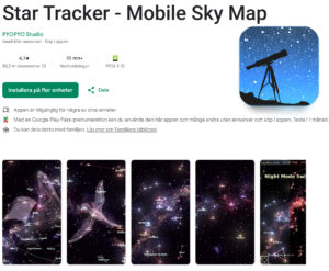 Star Tracker – Mobile Sky Map: Gratis (annonsfri12-35 kr), på engelska. Släppt juni 2014, uppdaterad jan 2026. Offline läge. Håll upp mobilen mot himlen och du ser alla stjärnor, planeter, stjärnbilder och deep-sky objekt i realtid. Ladda upp appen från Google Play